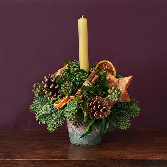 A mix of winter evergreens arranged in an aged terracotta pot and topped with a St Eval dinner candle. Dried elements of cones, cinnamon and fruit are added to complete this extremely long lasting display.