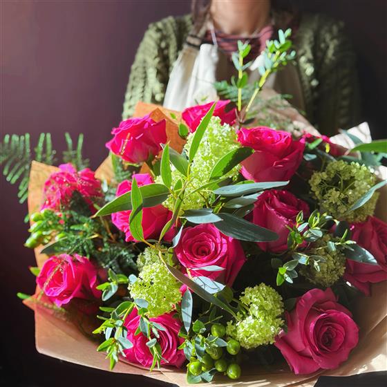A stunning bouquet of pink roses and seasonal foliage. A fabulous alternative to Red Roses for Valentine's Day.