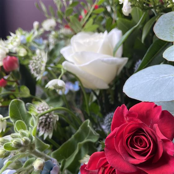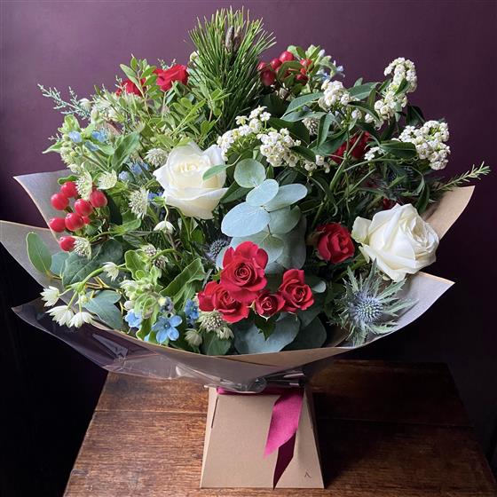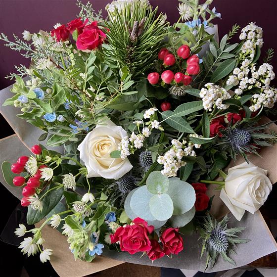 Wintery whites, reds and pale blue are mixed with scented foliages in our Scandi inspired hand tied bouquet.
