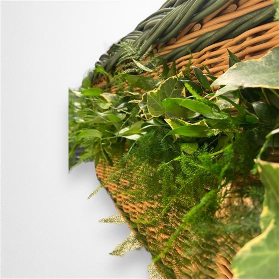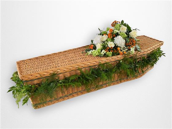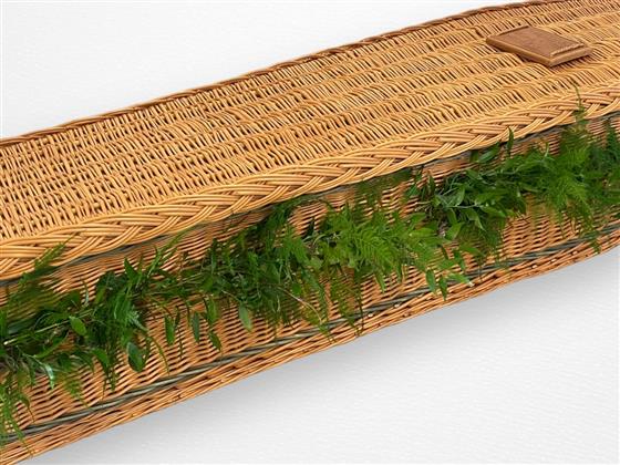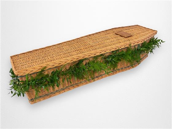 An eco-friendly, biodegradable and hand made garland of mixed foliages gently combined and woven through the outside of a natural coffin, such as Willow, Seagrass or Wicker.