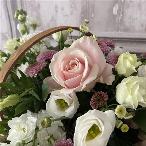 A garden trug filled with pink and white seasonal flowers; typically including Ranunculus for spring and Roses for summer.