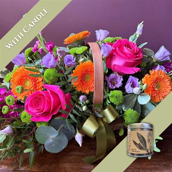 A joyful and bright mix. Our garden style trug is filled a vibrant mix of hottest pink, juiciest orange, zesty lime and a little cooling lilac to calm things down!