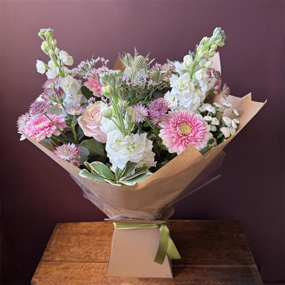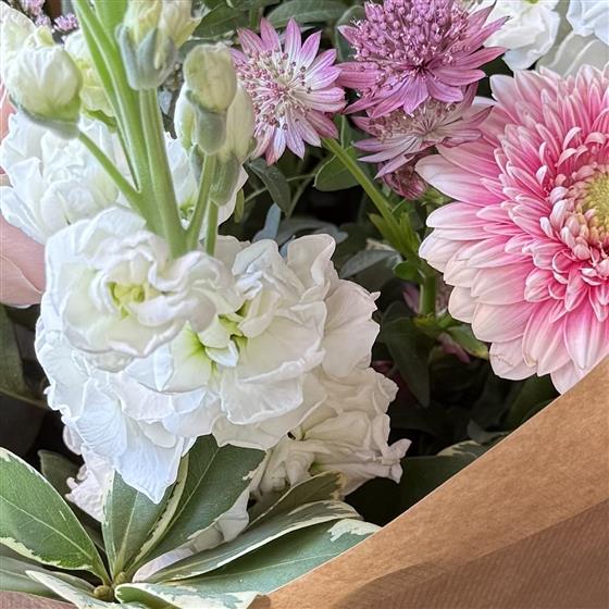 A pretty mix of white, cream and pink. Our florists choose the freshest scented stocks to combine with powder pink roses, gerbera, white eryngium and astrantia.