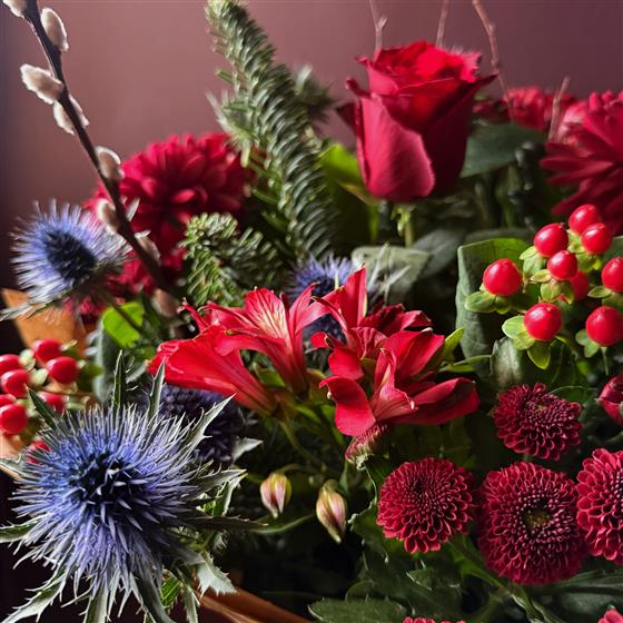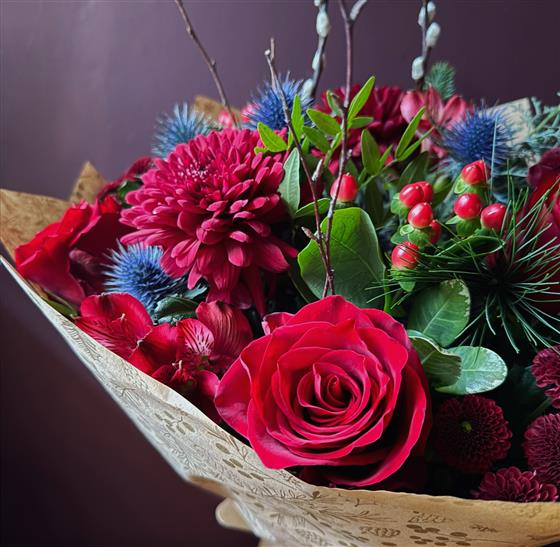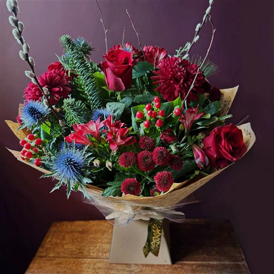 Classic Christmas colours abound in this beautiful hand tied bouquet of reds.