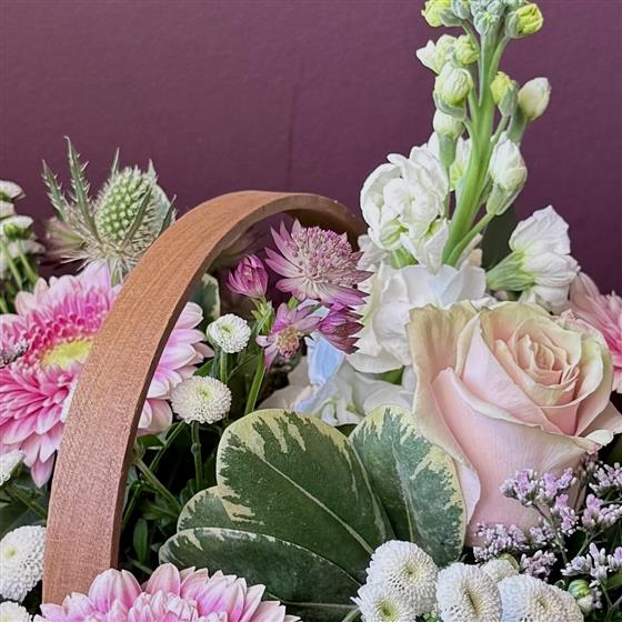 A delightful garden style trug filled with scented stocks, pink roses, gerbera and santini. This floral basket is created by our in house florists and is ready for instant display.