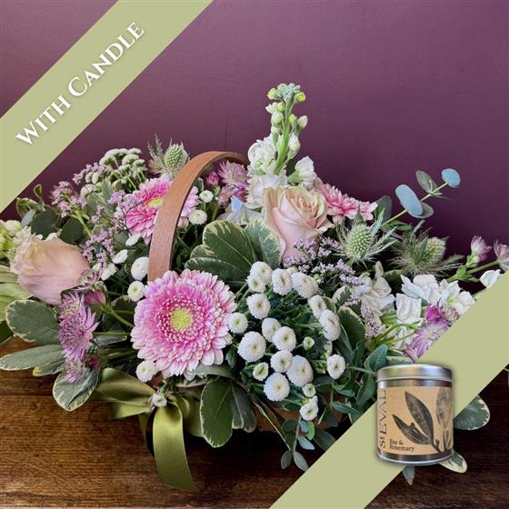 A delightful garden style trug filled with scented stocks, pink roses, gerbera and santini. This floral basket is created by our in house florists and is ready for instant display.