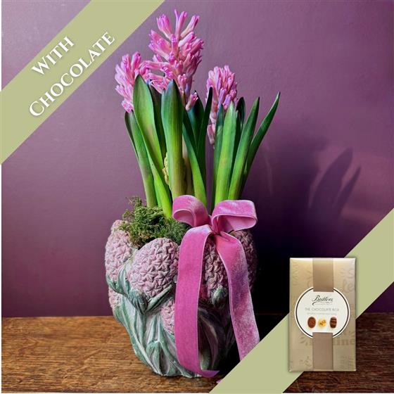 A beautiful heavy pot depicting pink Hyacinths and planted with Hyacinth bulbs, finished with moss and a bow. The pot makes a perfect spring vase once the Hyacinths have faded, and the bulbs can be planted outside to flower in future years.