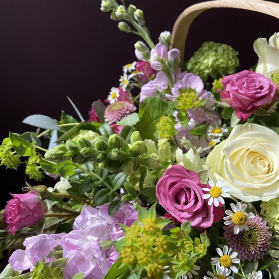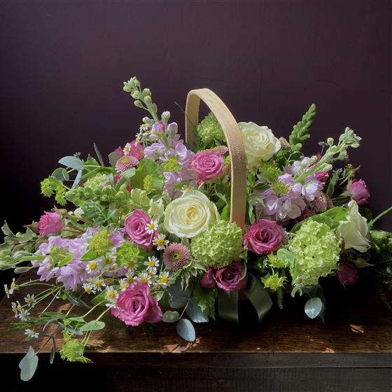 A trug style basket filled with seasonal flowers and foliage in shades of pink and white.